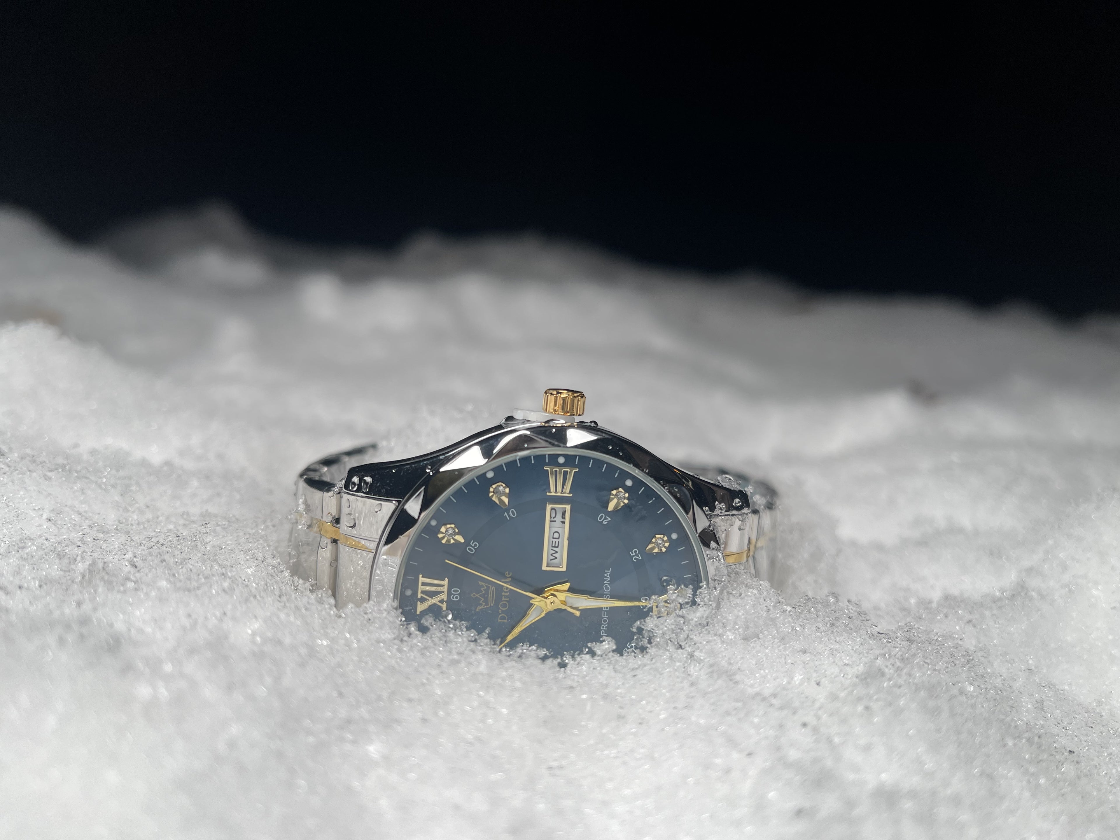 The black dial absorbs light like a winter night — silent, confident, eternal. Polished markers emerge with subtle brilliance, while the sculpted case adds depth and character without excess. Day and date rest in perfect balance, completing a composition defined by restraint, precision, and quiet strength.